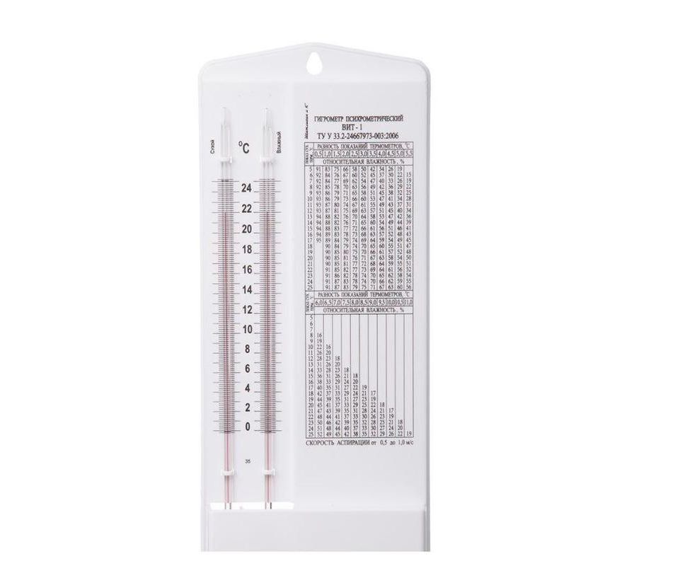 Гигрометр ВИТ-1 предназначен для измерения относительной влажности и температуры воздуха.Принцип действия гигрометра основан на разности в показаниях сухого и увлажненного термометров, в зависимости от состояния воздушной среды. На пластмассовом основании закреплена стеклянная шкала с двумя капиллярами, один из которых увлажняется фитилем из ткани опущенным в питатель с дистиллированной водой. По таблице закрепленной рядом определяется относительная влажность воздуха.